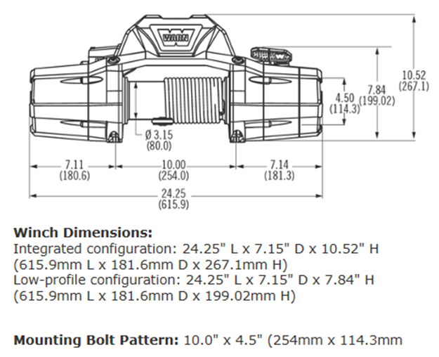 The use of winches larger then the manufacturers recommended maximum winch size is highly discouraged and could result in vehicle mounting point failure. The bumper accommodates most aftermarket 10,000lbs winches. We put one of the largest in this class (Warn Zeon) as an example. If you have a specific winch in mind you can compare it with the dimensions of the Warn Zeon 10,000 lbs. winch and as long as it is comparable in size you will be good to go. We have included a diagram with dimensions included of the Warn Zeon 10,000 lbs. winch below for your convenience.
