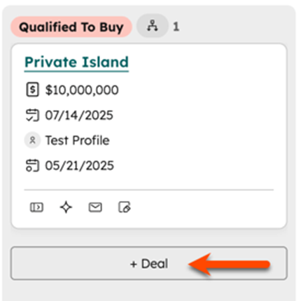 If you’re creating the deal from a contact or company record instead, open the record, use the Deals card, click + Add, then fill out the new deal and select the pipeline there.